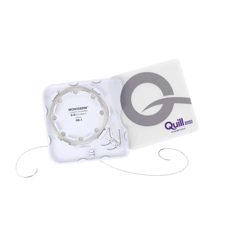 Quill™ Monoderm™ Bi-Directional combines monofilament absorbable material with knotless technology. Bidirectional barbs enable symmetrical wound closure and even tension distribution across the tissue.The monofilament structure allows smooth passage through tissue and is designed to minimize tissue response, supporting controlled healing and refined closure outcomes.